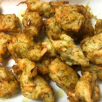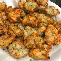 - 4 鍋底から3cm程の揚げ油を注ぎ、170℃に熱し、3をスプーンで一口大にすくい入れ、4分程揚げます。表面が色づき、中まで火が通ったら油を切り、お皿に盛り付けて完成です。