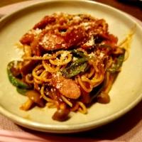 - 5 2を入れしめじがしんなりするまで中火で炒めたら(A)を加え全体が馴染むまで弱火で煮詰め、3を入れ全体に絡んだら火から下ろします。