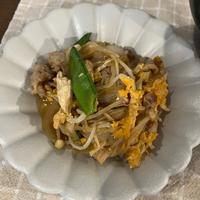 すき焼きの風味が楽しめる手軽な一品です。牛こま肉をメインに、えのき、もやし、ミツバなどの野菜をたっぷり使って、ジュワッと旨みが染み出すように炒めます。お好みで豆苗や長ネギ、ごぼうなども相性抜群。とろとろの卵でとじれば、ボリューミーな満足感が味わえます。味付けは醤油、みりん、砂糖で、めんつゆを加えるとコクが出ておすすめ。丼にしても美味しく、温玉をのせて食べるのもおすすめです。