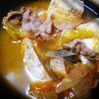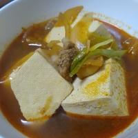 粉唐辛子をコチュジャンで代用しました。レシピの材料以外に油揚げとトッポギも入れてみました。