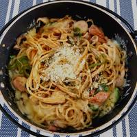 - 3 スキレットにオリーブオイルと2を入れて中火にかけ、水気を切った1と茹で汁、コンソメ顆粒、ケチャップを入れて手早く混ぜます。
