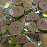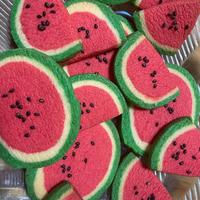 スイカの見た目をしたアイスボックスクッキーです。 見た目がとても可愛らしく、ちょっとしたプレゼントにもおすすめですよ。 スイカのタネを黒炒りごまにしていることで、香ばしさも感じられる美味しさです。ぜひお試しください。