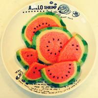 見た目もう少しスイカによせたかったので、食紅は緑と赤使いました!あとは少しアレンジしました!見た目可愛くて、ゴマとの相性が良くて美味しかったです!好評でした!二等辺三角形の形も入れるとよりスイカらしくてよりいいなと思いました!
