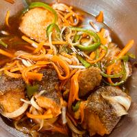 我が家では、ぽん酢、七味、三温糖を合わせたタレに千切りした野菜を入れて、冷蔵庫で20分位(量によって調整)浸してから、揚げ焼きした食材に乗せて「南蛮漬け風」で食べています☺とても簡単で、ぽん酢の柑橘風味が爽やかで美味しいです😄鶏肉や白身魚にも応用しています◎