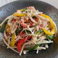 レンジだけで簡単に調理できるのが最大の魅力です。えのきのシャキシャキした食感とカラフルなパプリカやピーマンの彩りが楽しい一品。はちみつの自然な甘みと胡麻の香ばしさが調和した絶妙な味わいを楽しめます。むね肉や豚肉を加えてメインおかずにアレンジする方も。お弁当のおかずとしても最適で、作り方もシンプルなので、もう一品欲しい時の救世主的な存在です。