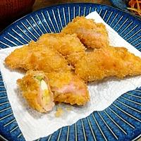 - 7 揚げ油をフライパンの底から3cm程の高さまで入れ、170℃に熱します。6を入れて2分程揚げ、裏返して更に2分程、衣がカリっとなるまで揚げ、取り出して油を切ります。