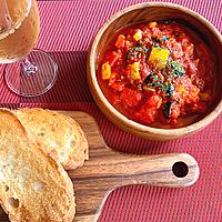 赤、黄のパプリカを使ったトマト煮込みです。トマトの酸味と甘味がパプリカに染み込むので、バケットなどにつけて食べても美味しいです。パプリカの色味が綺麗で鮮やかなので、見た目も華やかです。是非、お試しください。