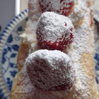 - 5 2に4を塗り、いちごを乗せ、再度4を塗り、2を重ねます。これを2回繰り返し、最後に2の上に4、仕上げ用のいちごを乗せ、粉糖をかけたら完成です。