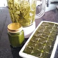 バジル30gしかなかったので、全部1/4ずつにしてつくりました。松の実はカシューナッツで代用、追加で粉チーズをたくさん入れた。