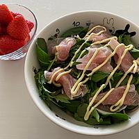 - 4 3の上にベビーリーフと生ハムを盛り付け、マヨネーズをトッピングして完成です。