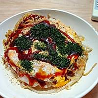 - 7 空いたスペースに、卵を割り入れて黄身をつぶし1分焼いたら6をのせて裏返し、表面に中濃ソースを塗ります。