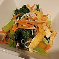 - 1 小松菜は根元を切り落とし、3cm幅に切ります。にんじんは千切りにします。