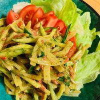 サッと茹でた、シャキシャキ食感のジャガイモがおいしい和風サラダです。淡白なジャガイモの風味は、青のり醬油風味のドレッシングと馴染みやすく、白いご飯と相性が良いひと品です。一年中購入しやすいジャガイモがメインなので、葉物が高騰した時にもオススメです。