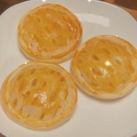 - 5 更に別の4枚にフォークで穴を開け、中心に1を乗せ、ふちに卵黄を塗ります。