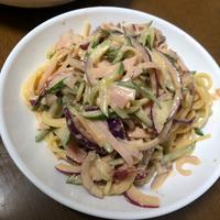 今晩のおかずに、シャキシャキ野菜たっぷりのサラダスパゲティはいかがでしょうか。クリーミーなマヨネーズ味なので、お子様でも食べやすく、付け合わせにもぴったりですよ。お酒のおつまみとしても最適なので、是非作ってみてくださいね。