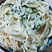- 6 鍋にお湯を沸かし塩とスパゲティを入れ、パッケージの表記時間通り茹で、湯切りをし、冷水で冷やし水切りをします。
