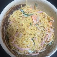 ハムをカニカマ4個で代用!茹で時間は3分プラス、他の方のレポであったケチャップ少し加えてめちゃうま!!生クリームとレモンは入れてません。リピリピリピリピリピ!!