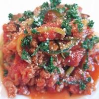 - 5 同じフライパンに2、豚ひき肉を加え中火で炒めます。豚ひき肉に火が通ったらカットトマト缶、コンソメ顆粒を加え炒めます。
