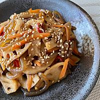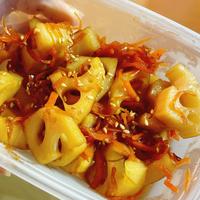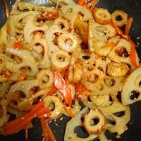 人参入ると見た目綺麗ですね~🤗お弁当におすすめ♪ピリ辛でご飯が進みます😁蓮根のシャキシャキ感が大好きなので厚めに切りました♪美味しかったです😋