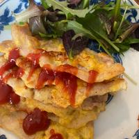 厚切りロースを使いさらに溶けるチーズものせてみました。柔らかい豚肉に卵とチーズとケチャップの相性も良く 美味しくいただきました。