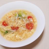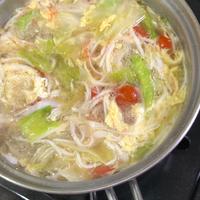 塩の代わりにナンプラー入れたらエスニック風のスープになりました。美味しかったです。卵と片栗粉は入れませんでした。