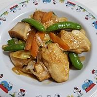 ササミが3本しか無かったのでかさ増しに厚揚げ、彩りに冷蔵庫にあったスナップエンドウと人参入れました。バターとオイスターソースとっても相性よく美味しかった。