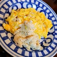 - 5 フライパンにサラダ油を強火で熱し、余分な油を拭き取ります。4を入れてすぐに箸でかき混ぜ、半熟状態になったら火からおろして3の上にかけます。