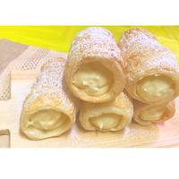 - 2 パイシート一枚を4等分にカットします。麺棒で伸ばしさらに縦に半分にします。