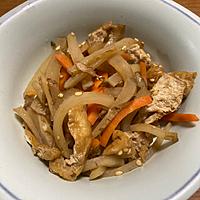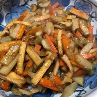 菊芋のきんぴら炒めのご紹介です。シャキシャキとした食感の菊芋を、にんじん、油揚げと一緒にきんぴら炒めにしました。しっかりと甘辛く味つけしました。ごはんのおかずにもぴったりですよ。ぜひ作ってみてくださいね。