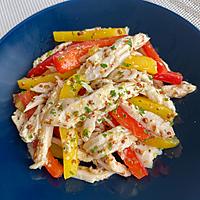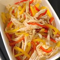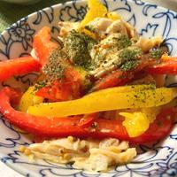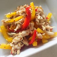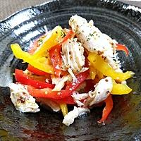 彩りあざやかなパプリカを使った簡単なサラダのご紹介です。パプリカの甘みと、粒マスタードの酸味がとてもよく合います。加熱してほぐして入れた鶏肉にもしっかりと味が染み込みおいしくいただけます。お酒のおつまみにもおすすめの一品です。