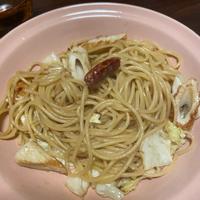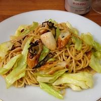 - 3 ちくわ、キャベツの葉を加えて塩胡椒し、キャベツがしんなりしてきたら茹でパスタを入れ、塩昆布を加えます。