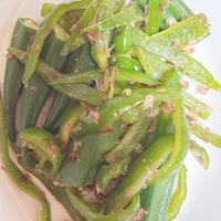 ピーマンが大きかったので、オクラを8本。調味料は醤油をほんの少し増やし、おかかは多めに。お弁当のおかずに。美味しくて、いくらでも食べられる味なので、次回は二倍の分量で作ろうと思います。
