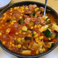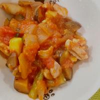 ズッキーニ1本、ナス1本、パプリカ1個、玉ねぎ半分にベーコンとしめじと冷凍枝豆を適当に加えました。野菜の量がとんでもなかったのでトマト缶400gを丸ごと使いました🍅煮込み時間も記載通りにしましたが、問題なかったです✨トマト美味しい😍野菜たくさん取れるし、これは良いですね!