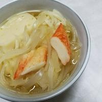 長ねぎの代わりに玉ねぎ、かまぼこの代わりにカニカマを使いました🍜