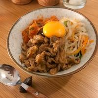 - 7 ごはんをよそった丼に5、6、キムチを盛り付け、中心にコチュジャンと卵黄をのせて完成です。