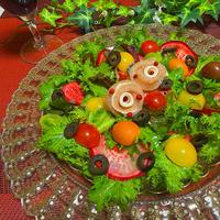 生ハムで形成した薔薇と、ブラックオリーブ、カラフルミニトマト、スライサーで薄切りした赤かぶで◎
