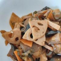 - 6 フライパンに(A)、昆布を入れ中火で熱し、ひと煮立ちしたら1、水気を絞った4、5を入れ炒めます。水分が1/3量ほどになったら火から下ろし、耐熱ボウルに移します。粗熱が取れたら落としラップをし、冷蔵庫で1時間、味を馴染ませます。