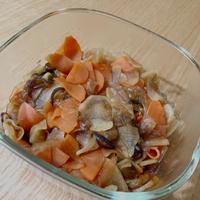 - 5 鍋にお湯を沸騰させ、塩と2を入れ2分ゆで、お湯を切ります。