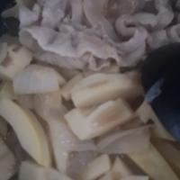 - 4 豚バラ肉の色が変わったら1を入れ、中火で炒め、玉ねぎがしんなりしてきたら調味料を加えます。