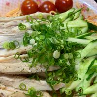 - 3 きゅうりは千切りにします。ミニトマトは半分に切ります。