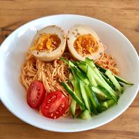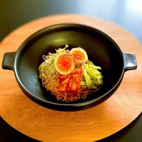 コチュジャンと豆板醤の組み合わせでピリッと刺激的な辛さが特徴的な一品です。素麺の繊細な食感と相性抜群で、きゅうりのさっぱりとした食感がアクセントになっています。キムチやサラダチキン、モヤシ、海苔などお好みのトッピングで楽しめます。夏にぴったりの冷たい麺として人気で、辛さが苦手な方は調味料を半分量にすることで自分好みの味に調整できます。