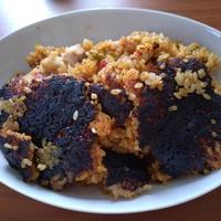 底の方が焦げてしまいました。スパイスを揃えて分量も守りレシピ通りに作ったのですが。5合炊きの炊飯器。みなさんが言うように水分多めでご飯はベチャッとしているのに焦げるなんて。焦げを全部取ってから鶏肉を盛り付けて食べました。悲しいです