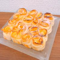 - 4 台に打ち粉をまぶして3を麺棒で半分の厚さになるまで伸ばします。のりしろ部分を1cmほど残し、少しずつ重ねてのせ、端から巻いて花の形に整えます。同様に10個作ります。