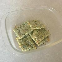 油はオリーブオイルに、粉チーズ、松の実、松葉パウダー、プロテインも加えてアレンジしていますが、サクサクで青のりの風味が良く、とても美味しいおやつでした。