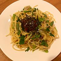 余っていたかいわれ大根と大葉も入れました。長ねぎとみょうがの量が多めなので満足感がありました。パスタに梅干しは初でしたが美味しかったです。