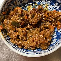 温泉卵をのせました。倍量で作ったのですが、ひき肉が少なかったか、ちょっと味が濃すぎました😓