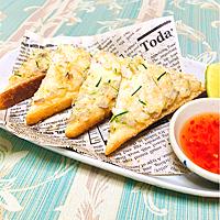 - 6 5を三角になるよう斜めに切り、パクチー、スイートチリソース、レモンを添えて完成です。