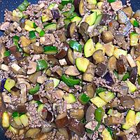 - 3 中火のまま、1を入れ、ズッキーニがしんなりとするまで炒めます。(A)を加え、豚ひき肉に火が通ったら、火から下ろします。