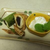- 3 ゆであずき、1をのせ、手前から奥に巻きます。