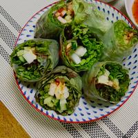 - 3 生春巻きの皮をお湯にくぐらせ、サニーレタス、1、2、チャンジャをのせて巻きます。